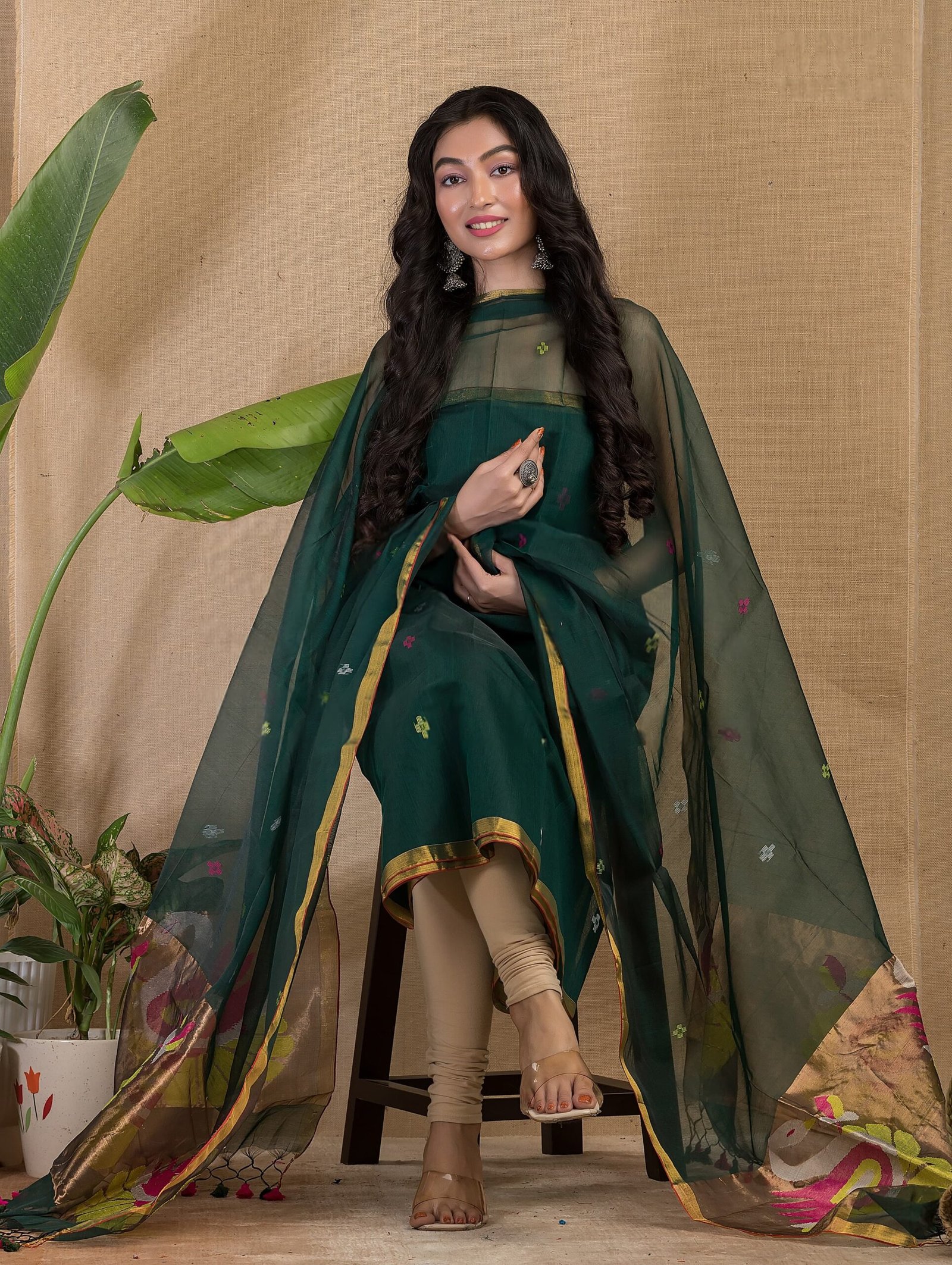Be the first to review “BOTTLE GREEN PAITHANI MUSLIN JAMDANI SET”